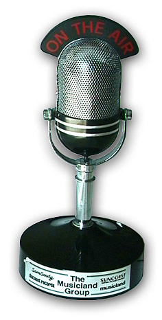 Novelty microphone transistor radio plays loud & clear on both AM + FM. The 'On The Air' mic with stand, distributed by Windsor, is a model #MR-7. It measures 4.75" W x 10" H; wt. = 10 oz. Also, requires (4) 'AA' batteries or Radio Shack DC power adapter.