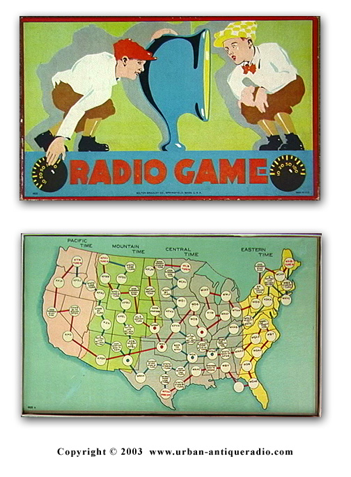 1926 Milton Bradley Radio Game #4625 in excellent condition. Boxed board game includes (2 of 4) wooden counters, spinner, multicolored lithographed board with instructions under top lid. Can be found in Warman's game book, p. 53. Excellent plus condition and very rare !... $495