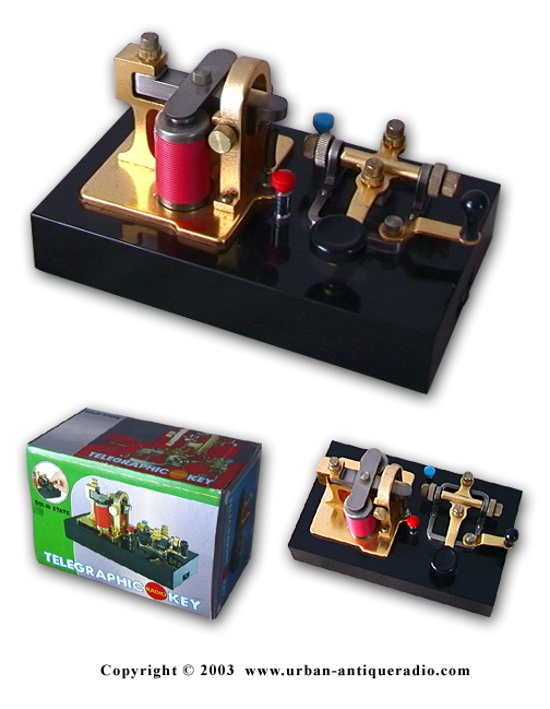 1970's Telegraph Key with Sounder. Besides the radio, you can actually use this as a code practice oscillator. It is brass-plated metal on a black plastic case. Plays loud & clear, Made in Japan, and measures 7-1/4" W x 4-1/2" D. Very rare, Mint-In-Box!... $295
